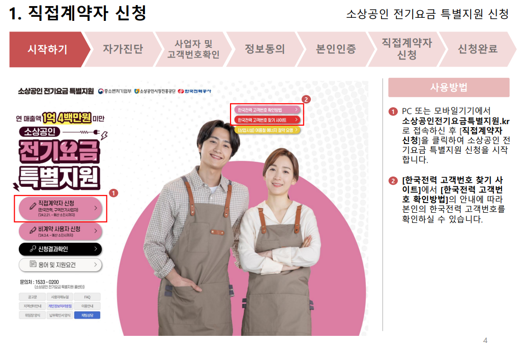 - 포털사이트에서 “소상공인 전기요금 특별지원”을 검색하거나 “소상공인전기요금특별지원.kr”에서 간편 신청 가능합니다.
